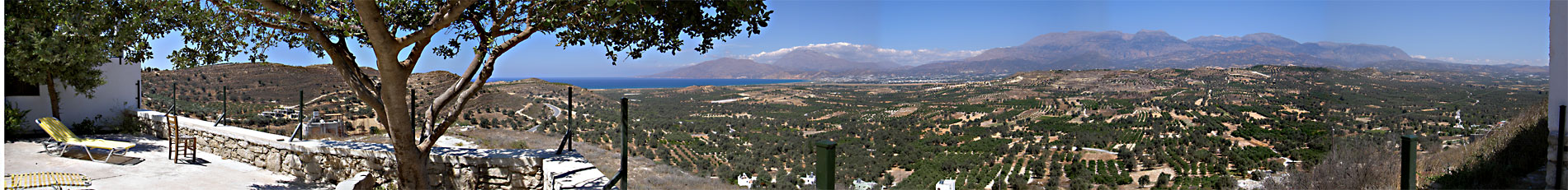 (Zu sehen von links nach rechts) Die Sonnenterasse der Ovgora - links Hügel in denen sich eine Minoische Villa finden lässt - der Weg nach Kalamaki (Strand 2,5 km) - Die Berge im Nord-Westen Richtung Sfakia/Agia Galini Timbaki - Messara Ebene, dahinter der Psiloritis - rechts schließt Kamilari an