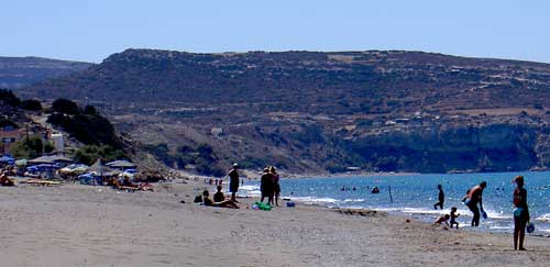 Der Strand von Kalamaki. Links: der Blick von Norden nach Süden, hinter dem ersten Hügel befindet sich der ehemalige Hafen der minoischen Stadt Phaistos. Unten: Blick von Süden nach Norden auf die Strandpromenade mit Restaurants und dahinter der Psiloritis.