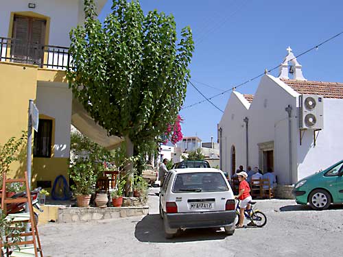 (links) Der Platz vor der Kirche in Kamilari. Ruhiges und entspanntes dörfliches Leben ohne Massentourismus.